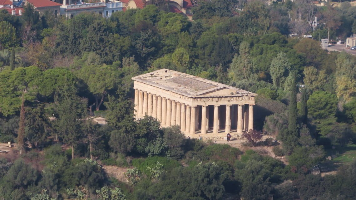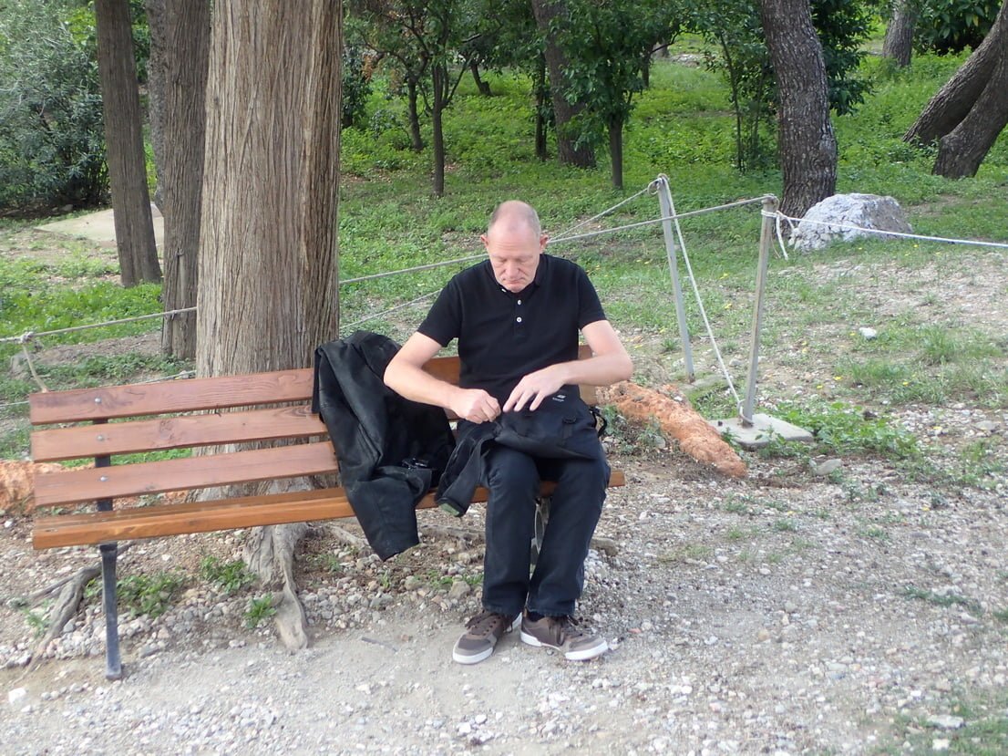 Als we na een paar uur alles gezien hebben lopen we verder en beklimmen de berg naar het Phiopappos Monument. Daarna lopen we over de bergtop naar een mooi uitzichtpunt van waaruit we tot aan de zee kunnen kijken. Op de weg terug gaan we langs een andere pad naar beneden maar dan staan we ineens voor een gesloten hek. Volgens 2 politie mensen aan de andere kant moeten we terug waar we vandaan kwamen om uit het naar later blijkt oplucht Dance theater te komen. We klauteren weer de berg op en vinden een pad. Frederick heeft ondertussen nog een zeldzame Griekse Landschildpad gespot.