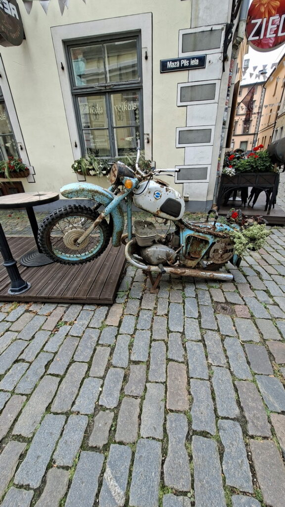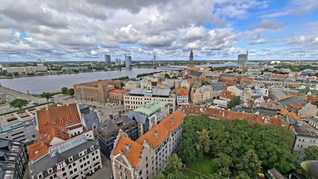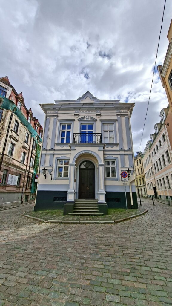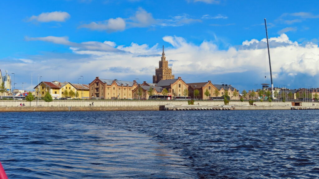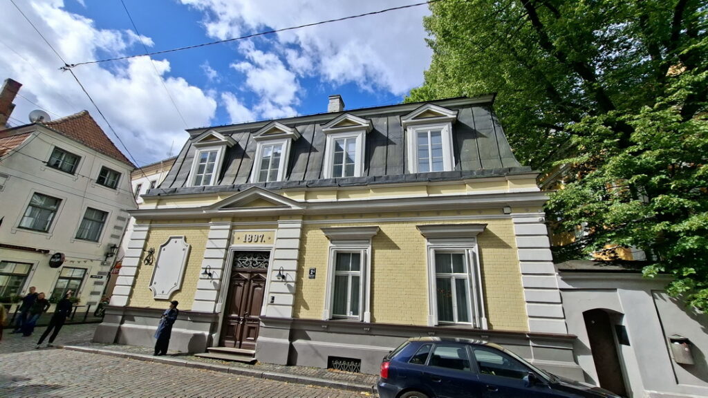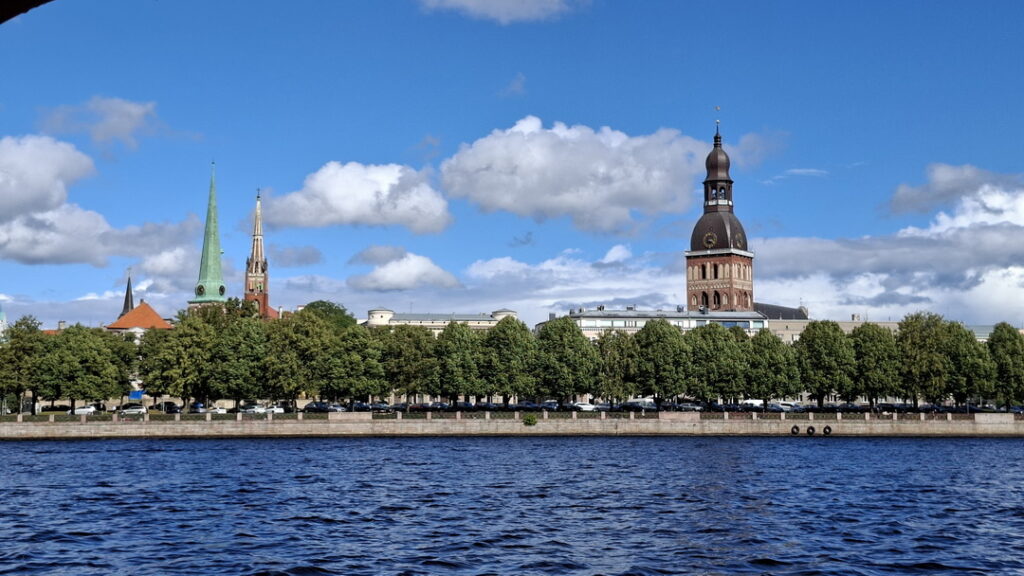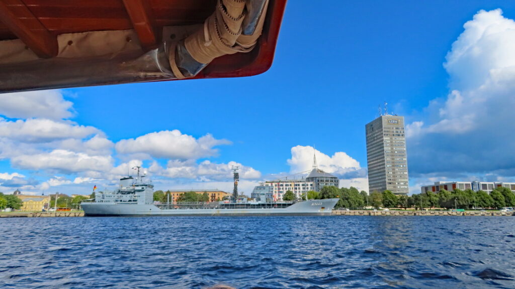 Daarna langs de Melngalvju Nams, het Black Heads house in het Engels. We hadden die vanuit de kerktoren al zien liggen. René wil daarna naar het Riga Castle maar dat was gemakkelijker gezegd dan gedaan. Zigzaggend langs bruggen en grote wegen komen we eraan, imposant groot met 2 torens, helaas niet te bezoeken want het is eveneens de residentie van de Letse president. Schuin voor het slot liggen 2 oorlogsschepen, 1 is de HM de Ruyter die daar een NAVO missie volbrengt met een Duitse collega. Je merkt eigenlijk niets van spanningen maar ze liggen wel te waken.