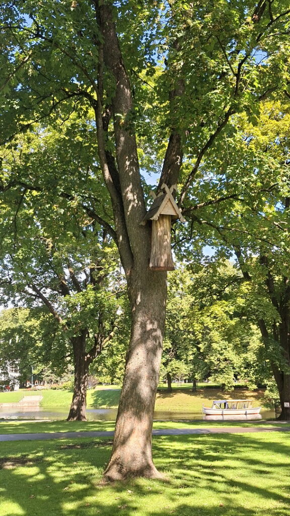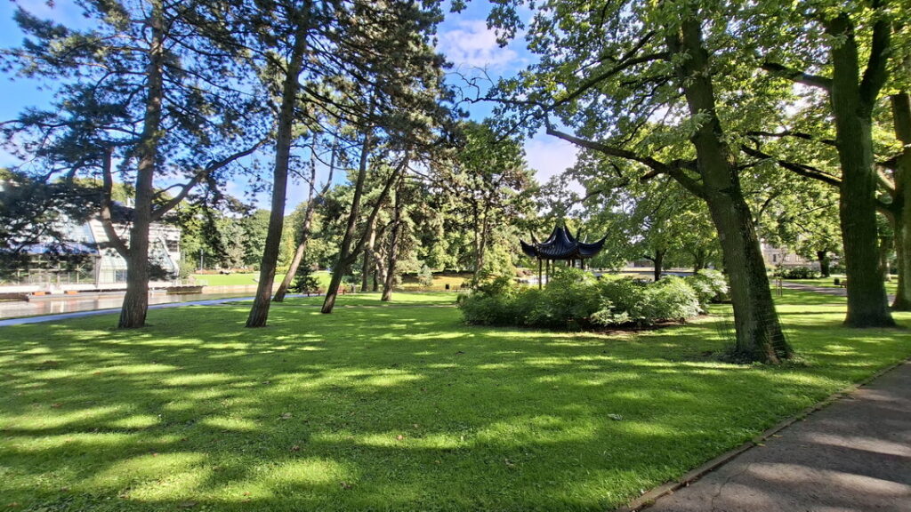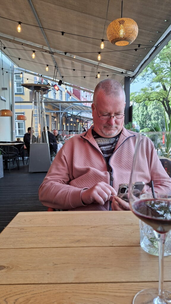 We wandelen nog wat door het park en gaan een terrasje opzoeken uit de wind en liefst met verwarming. Voor mij was het net teveel wind terwijl René het allemaal nog lekker heeft. Zelfs de kelner op het terras aan het plein loopt met een fleecedeken om. Gelukkig zitten wij op het terras tegen de gevel met verwarming.