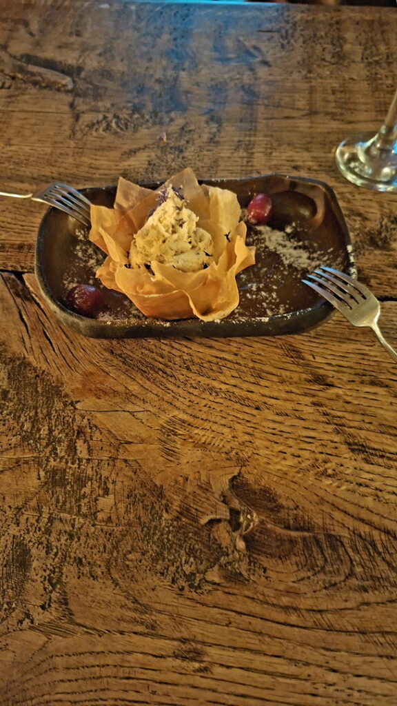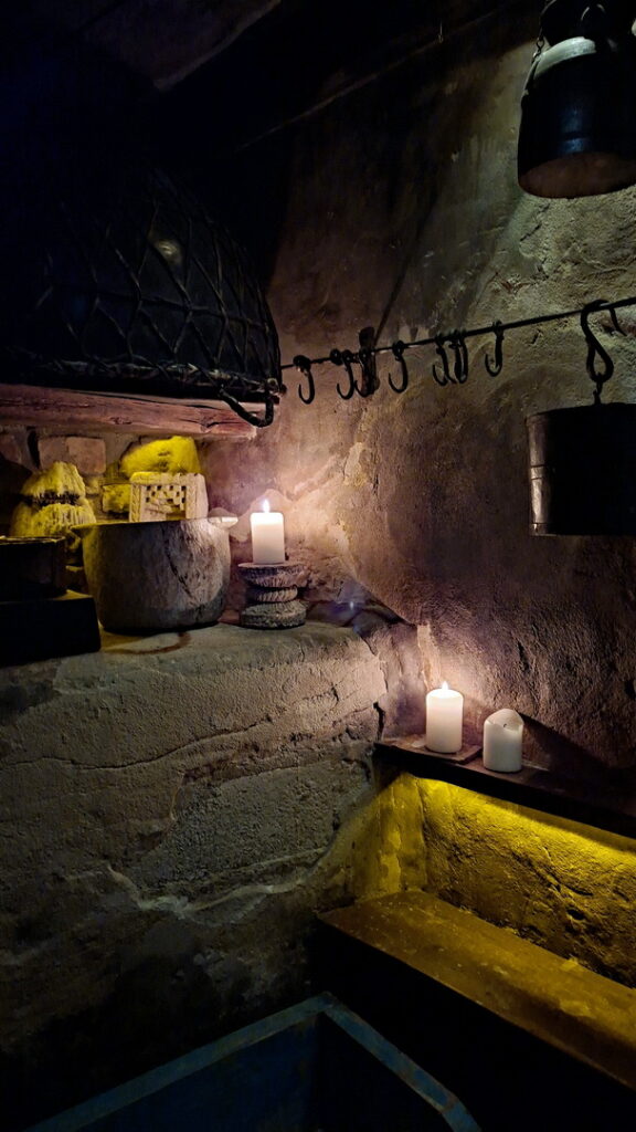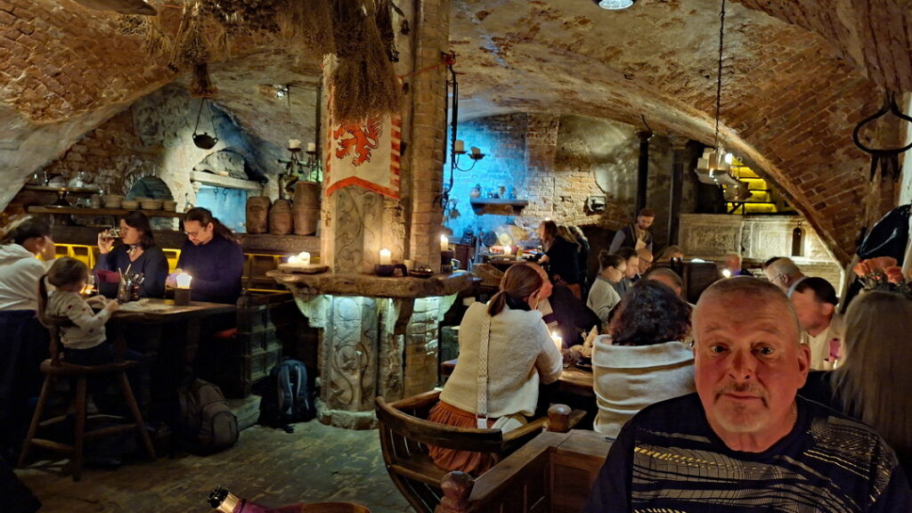Als het tijd is om te gaan eten dalen we af in de donkere catacomben van Riga voor het diner.