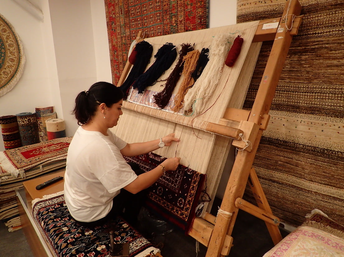 Als we dan een tapijten fabriek bezoeken hebben we ineens anderhalf uur de tijd. ( Dit is het verdienmodel van de reis).