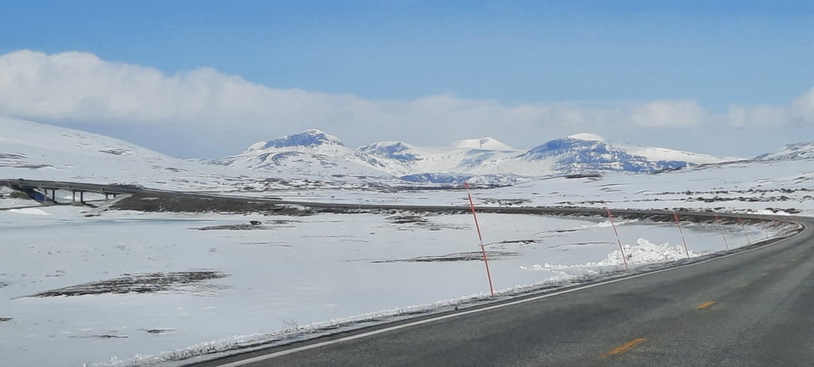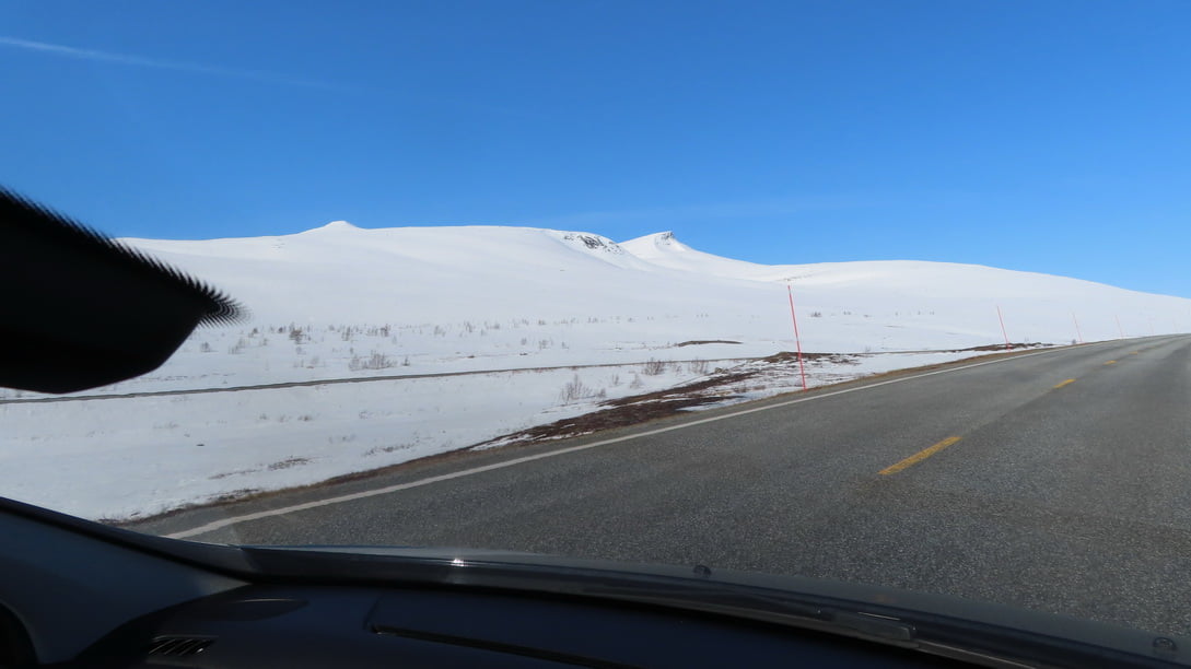 De voorspelde sneeuw is ons gelukkig bespaard gebleven. We rijden in slakkentempo naar de grens ongeveer 100 km verder. Alles is wit en ook de meren zijn allemaal bevroren, het is al met al een prachtig gezicht. Rond 10 uur passeren we de grens maar van een grenscontrole is totaal niets te zien. Opvallend is dat aan de Noorse zijde van de bergen, waarschijnlijk door de warmere invloed van de zee, nauwelijks sneeuw ligt.