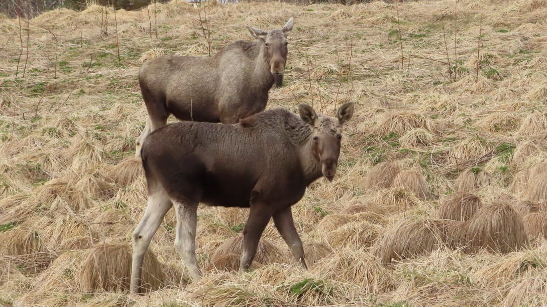 We draaien net de hoofdweg E10 op en daar zien we links van de weg 3 Elanden staan. Mooie grote exemplaren lekker rustig aan het grazen. Wat ons het meest verbaasde dat deze voorover op hun knieën gingen zitten om te eten want dat deden die van gisteren niet. Dit waren 3 mannetjes en forser van formaat. Het is nog vroeg en zeer rustig op de weg en dus kunnen we uitgebreid genieten van het aanzicht. Een van het drietal steekt voor de wagen de weg over en loopt door een tuin naar wat later bleek een 4de Eland.