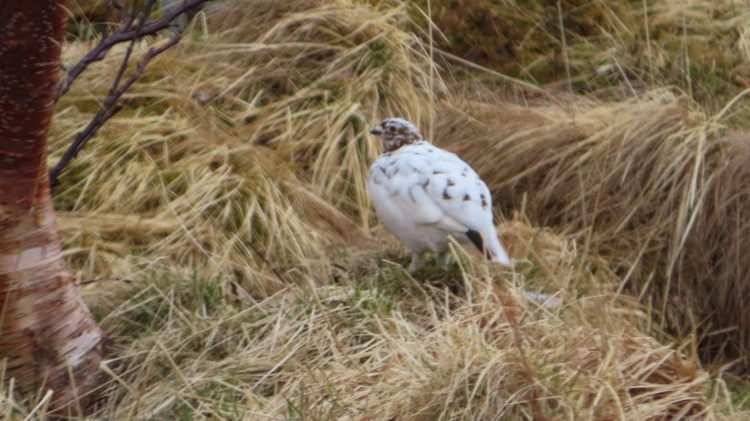 Daar zit nog een Hoen zeggen we tegen elkaar, oh nee het is een sneeuwvlek, verhip het huppelt weg, het blijkt een Sneeuwkonijn te zijn, geheel wit in de winter en rond eind mei wordt de vacht grijsbruin. We zien er later nog een maar ze zijn te schuw en bij de minste beweging zijn ze weg.