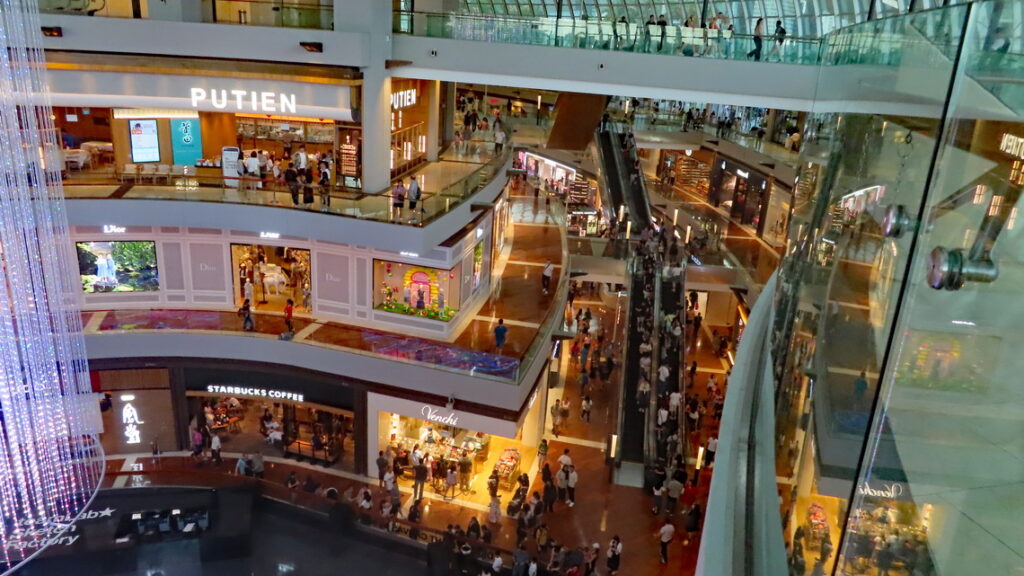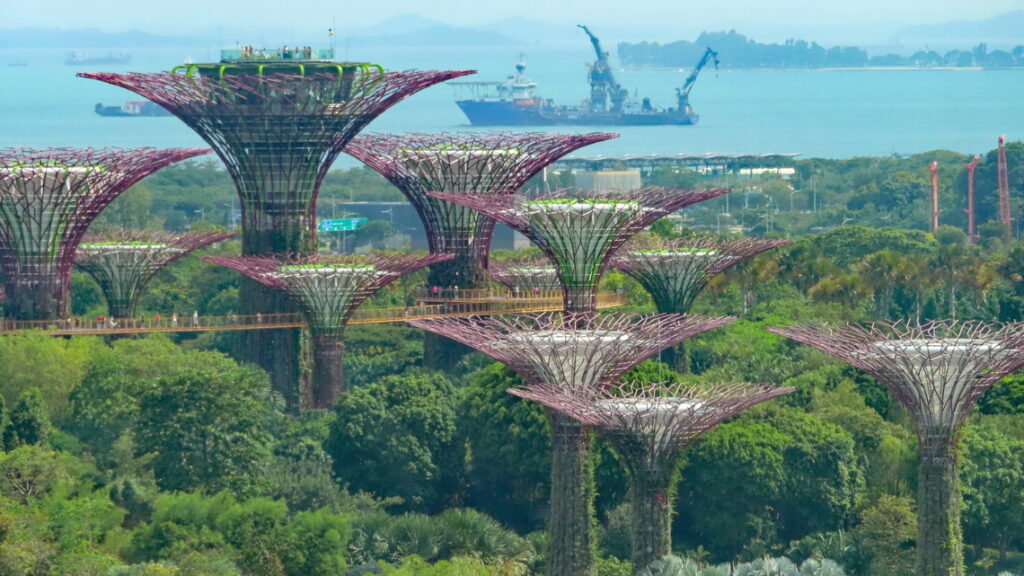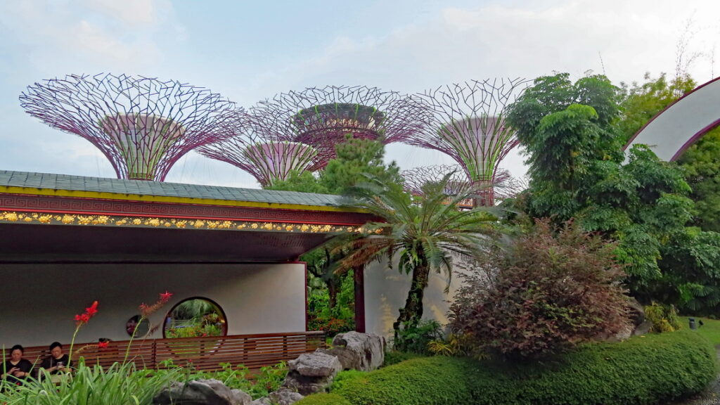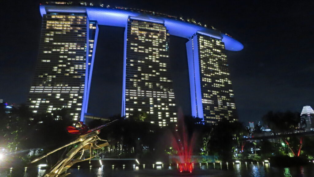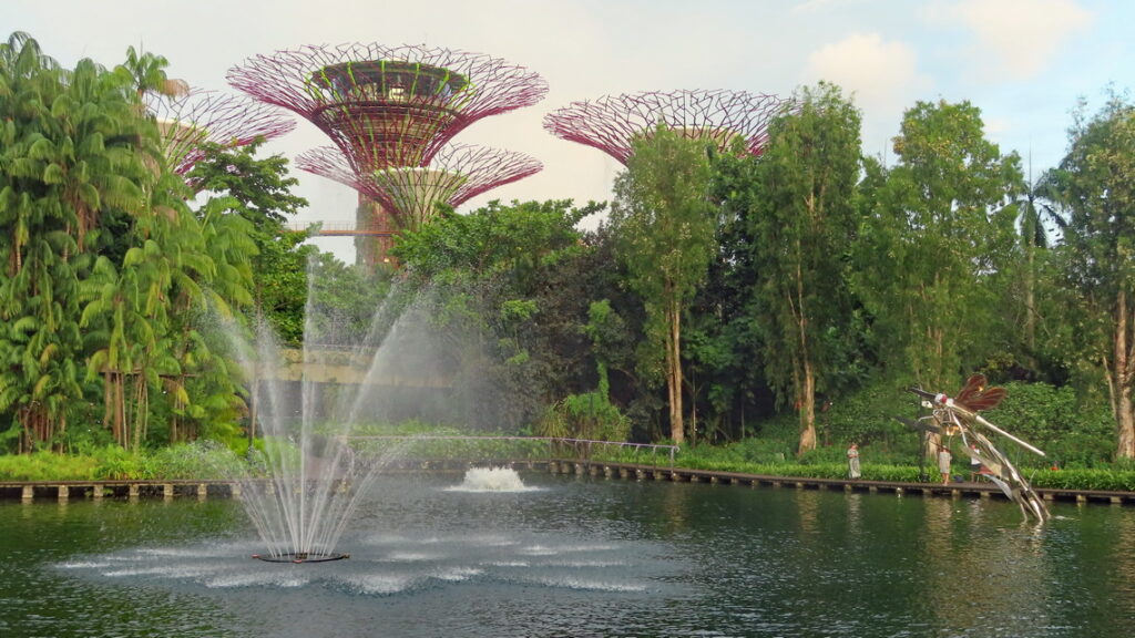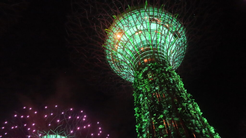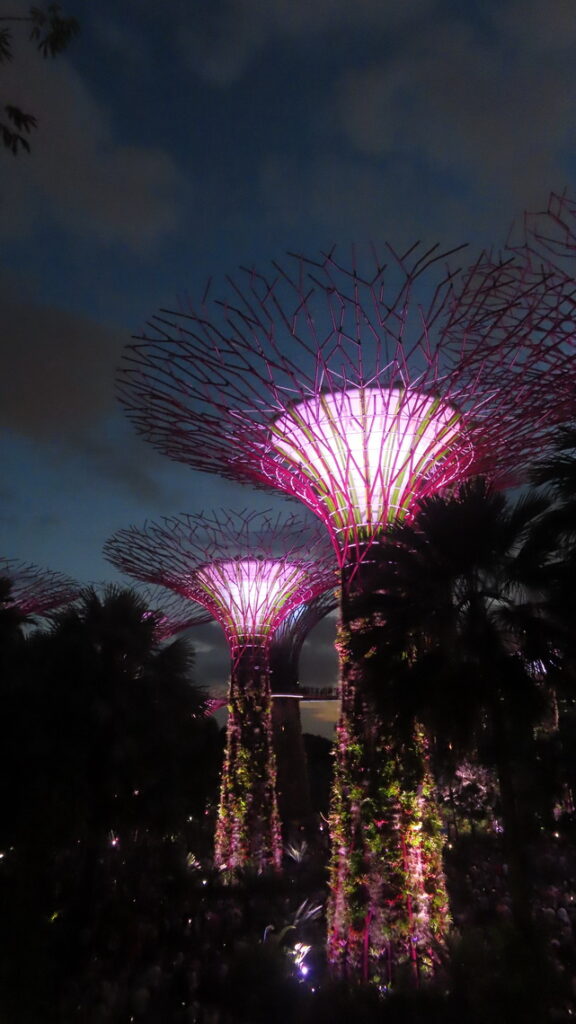 Vervolgens worden we op de terugweg op een heuse tropische stortbui getrakteerd. Tussen de plensbuien door lopen we via de DNA brug naar het winkelcentrum. Het was nog wat vroeg maar in dit overvolle en zeer luxe winkelcentrum blijven we wat eten en wachten tot de buien over zijn. Het restaurant was gelegen aan een soort grote trechter die met hemelwater een kunstmatige binnen rivier voedde. Zo konden we ook direct zien of het droog was. Inmiddels droog en een met de beginnende schemer besluiten we terug naar de Supertree Groove te gaan om die met verlichting te bekijken, dit ziet er echt sprookjesachtig uit. Het valt ons op dat er busladingen mensen worden afgezet en het park loopt werkelijk helemaal vol. De reden hiervoor was dat er ook hier ’s avonds een lichtshow wordt gegeven, Dit was in een woord geweldig, zou zomaar een André Rieu setting geweest kunnen zijn. Ik was achteraf heel blij met het in de shopping veel te duur gekochte usb kabeltje. De onze hadden we in het hotel vergeten en nu had ik toch de kans om foto’s te maken met de telefoon.