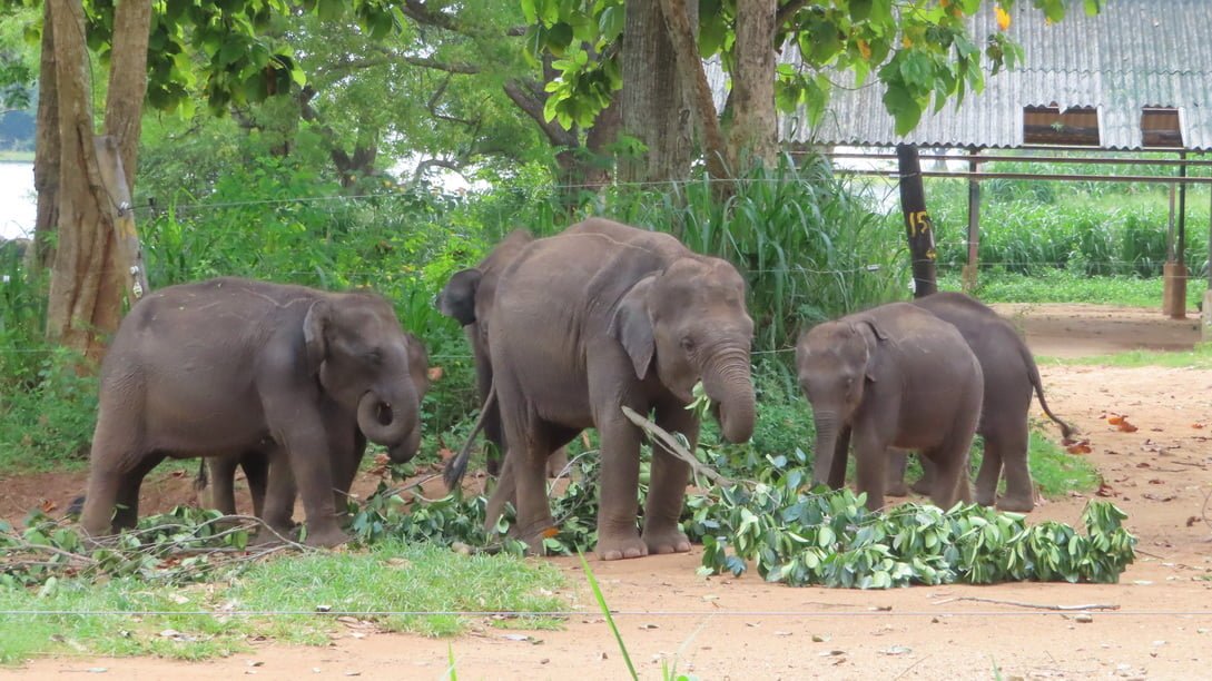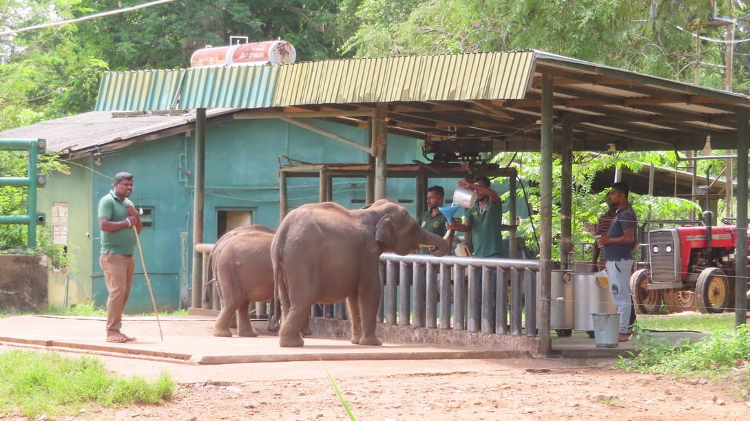 Na het ontbijt wandelen we de 4 kilometer naar het dorp. We besluiten geen safari te doen omdat het wildaanbod hier beperkter is dan in Yala, het vorige nationale park. Wij gaan naar het Elephant Transit Home, een opvang van Olifanten weesjes. Het lijkt uiteindelijk wel wat op het voederen in een dierentuin. Het moeten in totaliteit meer dan 50 olifanten geweest zijn in de leeftijd van een half jaar tot 7 jaar. Normaal drinken ze melk tot 3 jaar maar om het kudde gevoel te sterken krijgen ze op 2 na allemaal melk. Sommige slimmeriken lopen zelfs een rondje voor een 2de portie, maar als de oppasser het merkt worden ze gesommeerd plaats te maken voor andere olifantjes. Ze krijgen een slang in hun mond met een trechter waarin de melk gegoten wordt, 2 kannen per olifantje. De 2 kleinste krijgen een zuigfles.