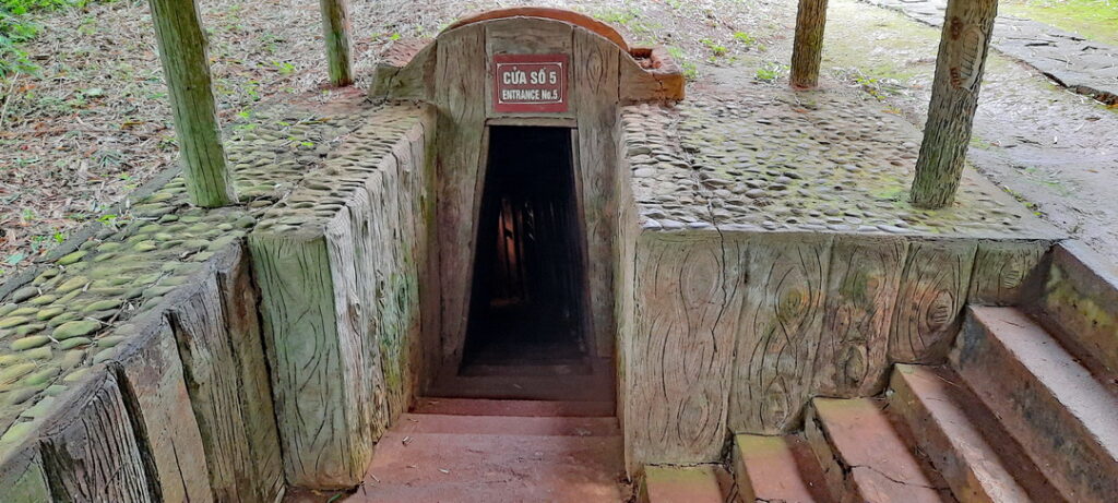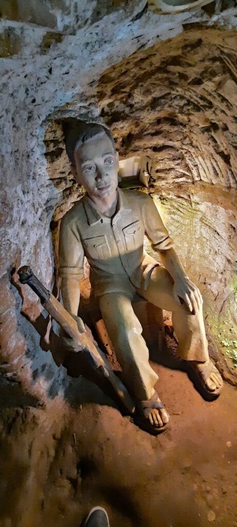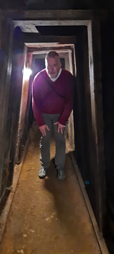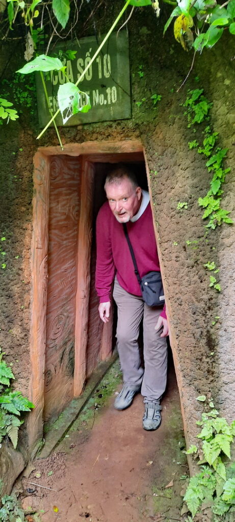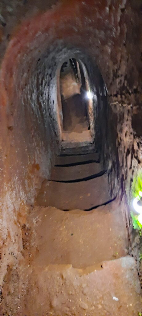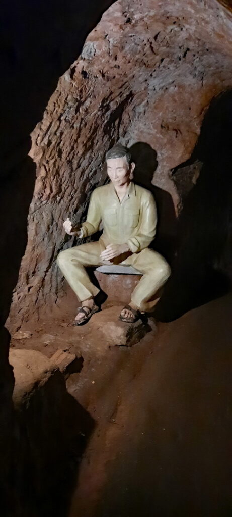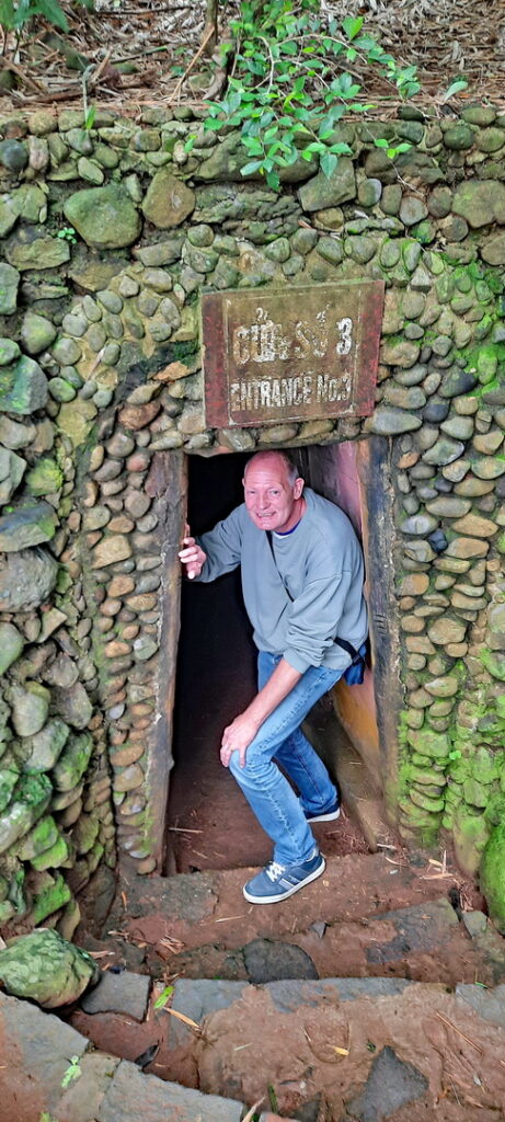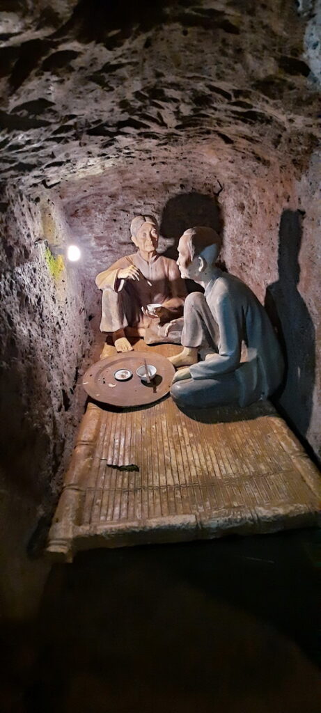Bezoeken de tunnels die voor onze gids op de juiste hoogte, zo’n 1.40 meter zijn, maar voor ons betrekkelijk laag en warm.