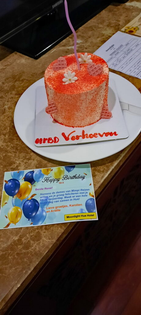 Even later blijken de dames van Mimpi ons wederom verrast te hebben met een lekkere ontvangst, een taartje ter gelegenheid van René zijn verjaardag. We besluiten die onder het genot van een drankje in de rooftopbar soldaat te maken. Lopen we de receptioniste tegen het lijf die naar ons onderweg was, blijkt de tour al volgeboekt. Dan toch overmorgen is de oplossing.
