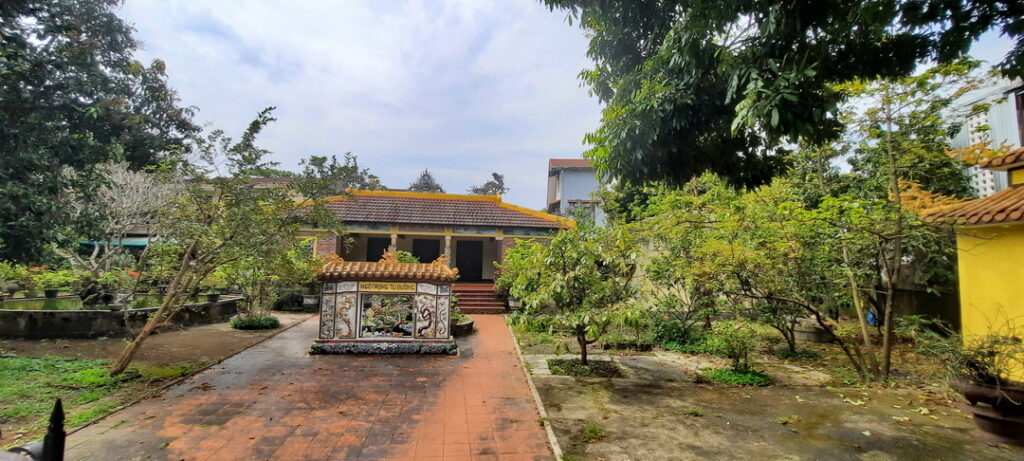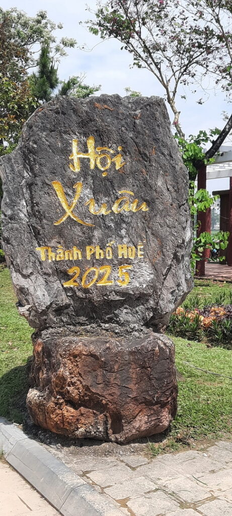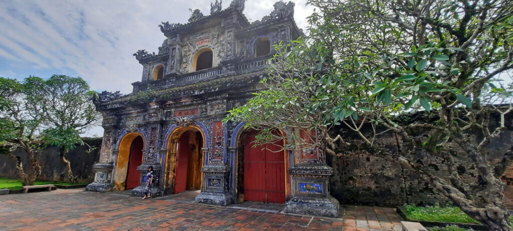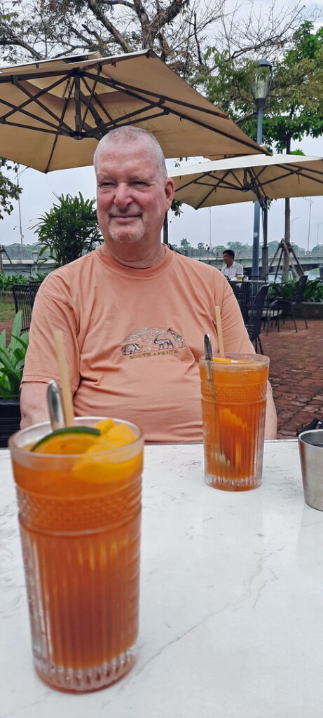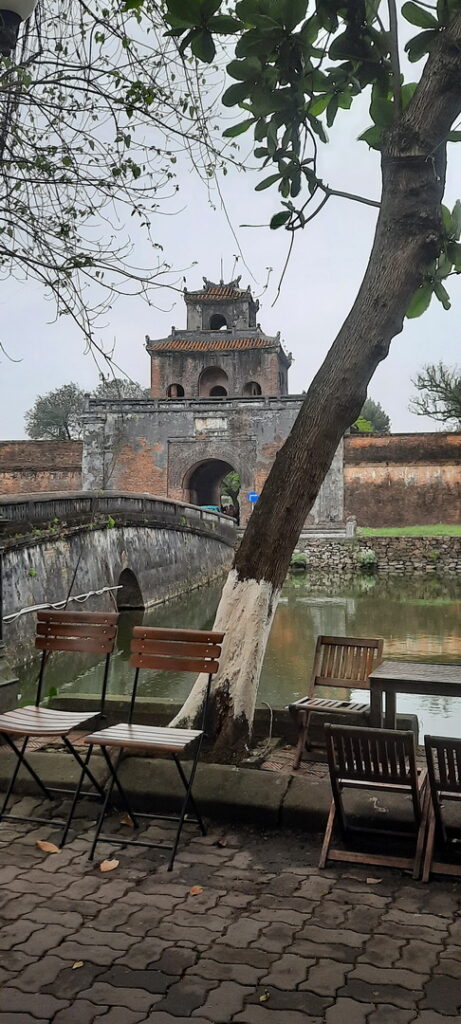 De highlights van Hué hebben we gezien dus we maken er een lekker rustige dag van en slenteren langs de Huong rivier. We pakken een terrasje mee met een heerlijke vers gezette Icetea Peach & Lime. We slenteren verder langs de rivier en door woonwijkjes. We lopen ook een heel stuk langs de citadel en zien aan de kant waar we gisteren niet kwamen nog een poort waar ook verkeer doorgaat. We lopen die richting op en langs de gracht van de citadel ligt een terras in de luwte te lonken. Geen straf, een icetea en jus d’orange met een Banh Mi en Bahb Xeo gaan er ook wel in.
