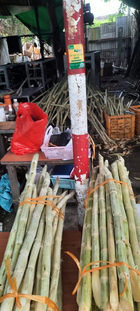 Van buiten is de poort zeker zo mooi als van binnen. Gluren nog even binnen bij een suikerfabriekje waar lange stengels donker suikerriet van de harde schil worden ontdaan, geschaafd en in stukken gesneden. De ruwe donkere tot wel 3 meter lange stengels hadden iets weg van bamboe.