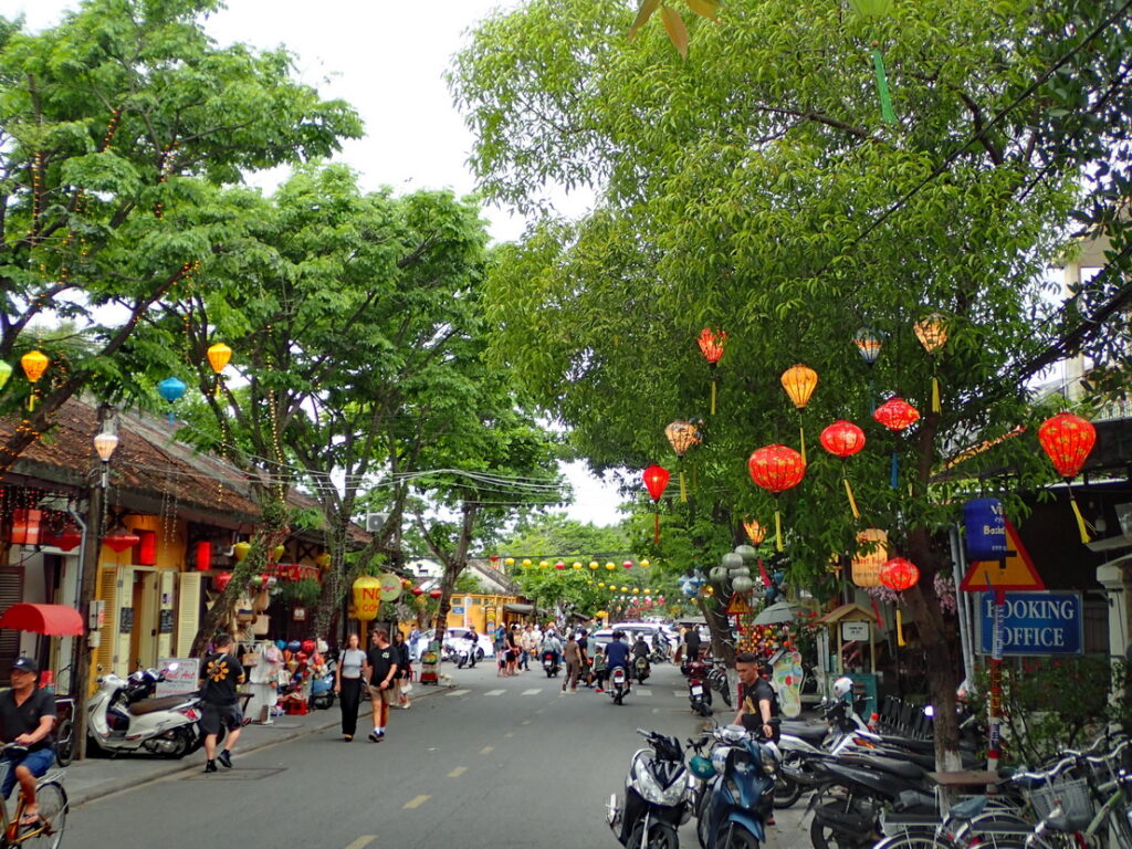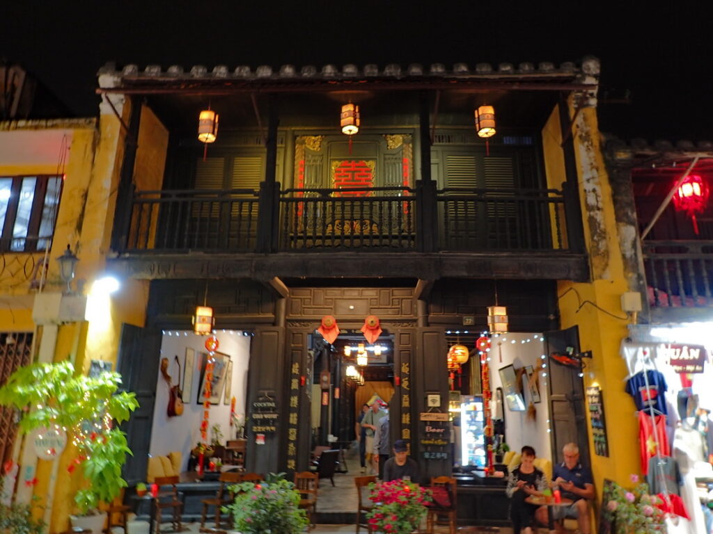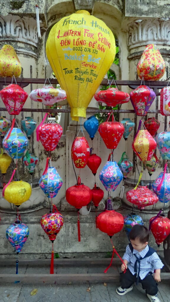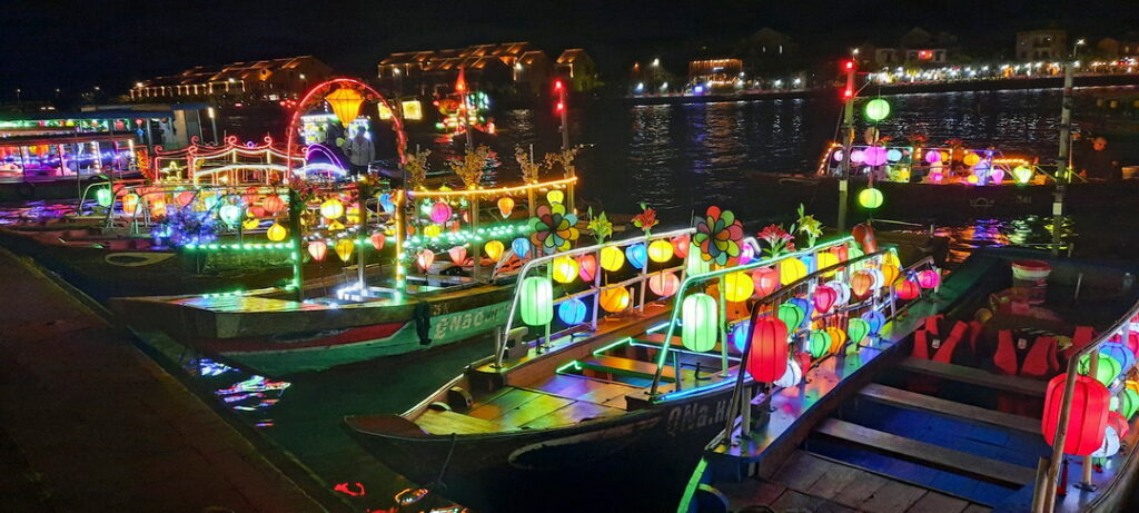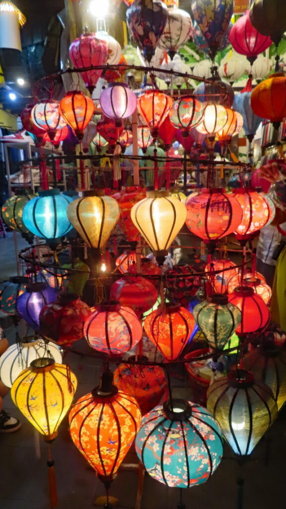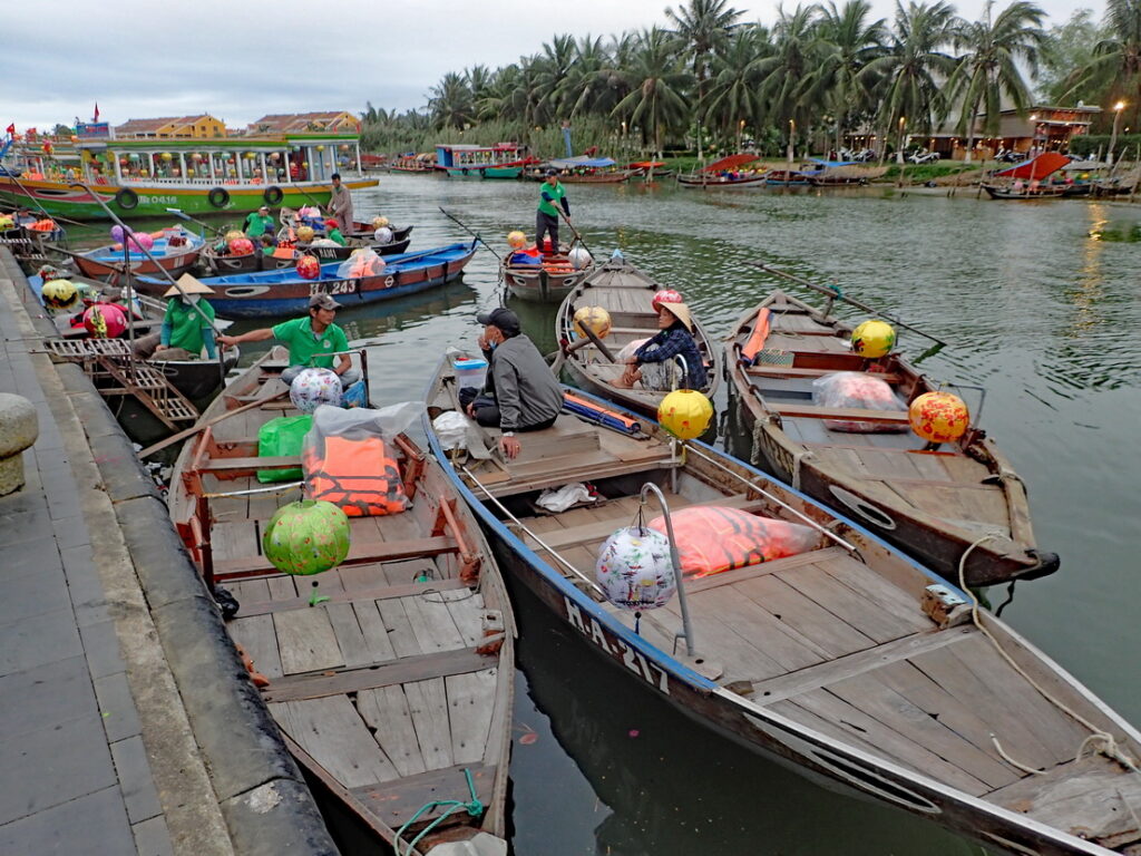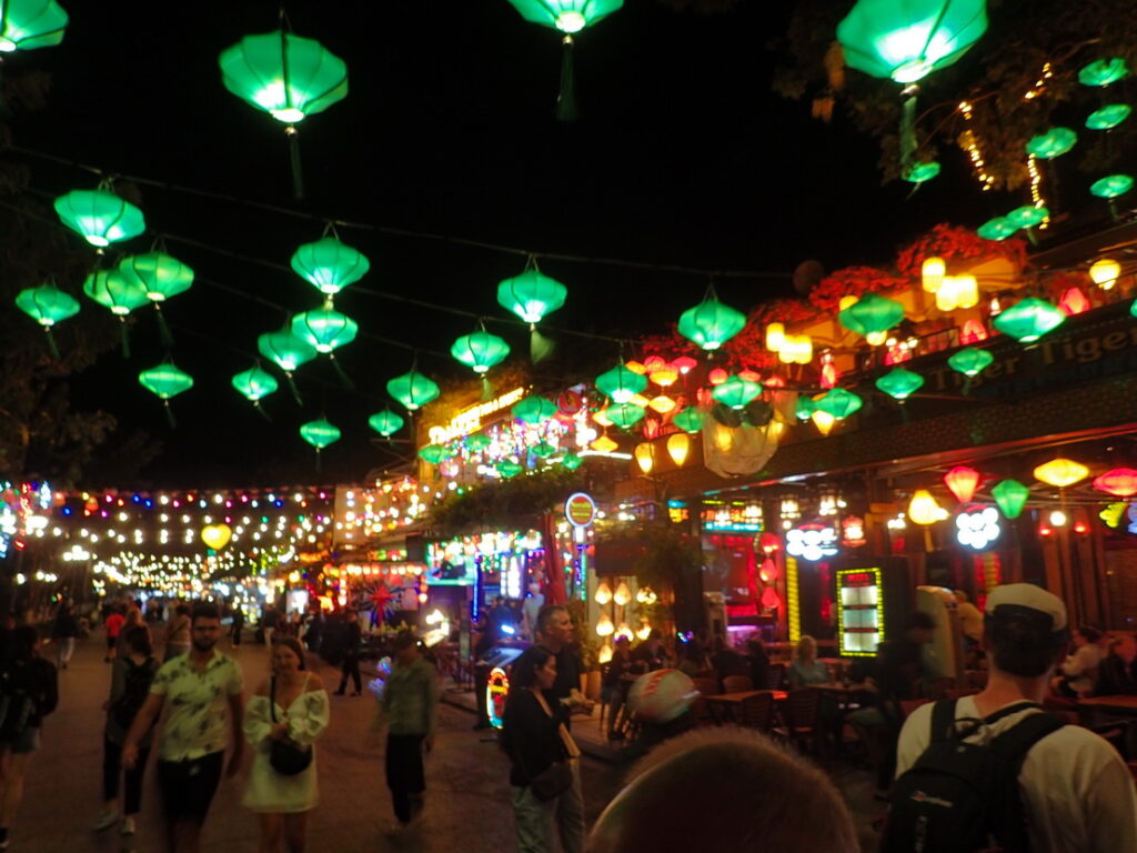 Rond half 2 werden we weer bij het hotel afgezet en hadden dus veel tijd over. Het was behoorlijk gaan waaien en dat werd een extra trui. De receptioniste vertelde ons over de lampionnen, dat wisten we al, maar dachten dat dat enkel op de 14de lunar van de maand was en dat was niet nu. Het is eigenlijk elke avond lampionnenfestival. Wij nemen de shuttle naar de stad en laten ons om 21 uur weer ophalen. We duiken de stad weer in en bezoeken nog wat andere huisjes, pakken een paar terrasjes en eten wat op de avondmarkt. Het wordt al lekker donker en het magische spektakel is begonnen… overal verlichte lampionnen, bootjes versierd met kleurige lampjes en mandjes met kaarsjes. Het trekt ontzettend veel volk zodat je bijna over de hoofden kan lopen.