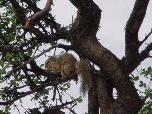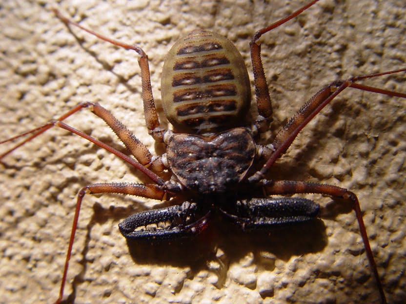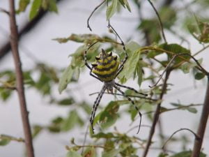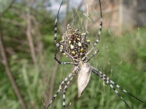 Tegen de avond gaan we op het lodge terrein samen met een Zuid-Afrikaan eens kijken wat er zoal rondkruipt en dat levert een mooi aantal insecten op. We zien onder andere de Schorpioenspin en de wielwebspin (Argiope australis (25mm lichaamslengte) heeft een geschulpte buik met gele en zwarte banden). Ook zien we nog een Schorpioen wat zeer waarschijnlijk de Mozambique dikstaartschorpioen (Parabuthus mossambicensis) is.